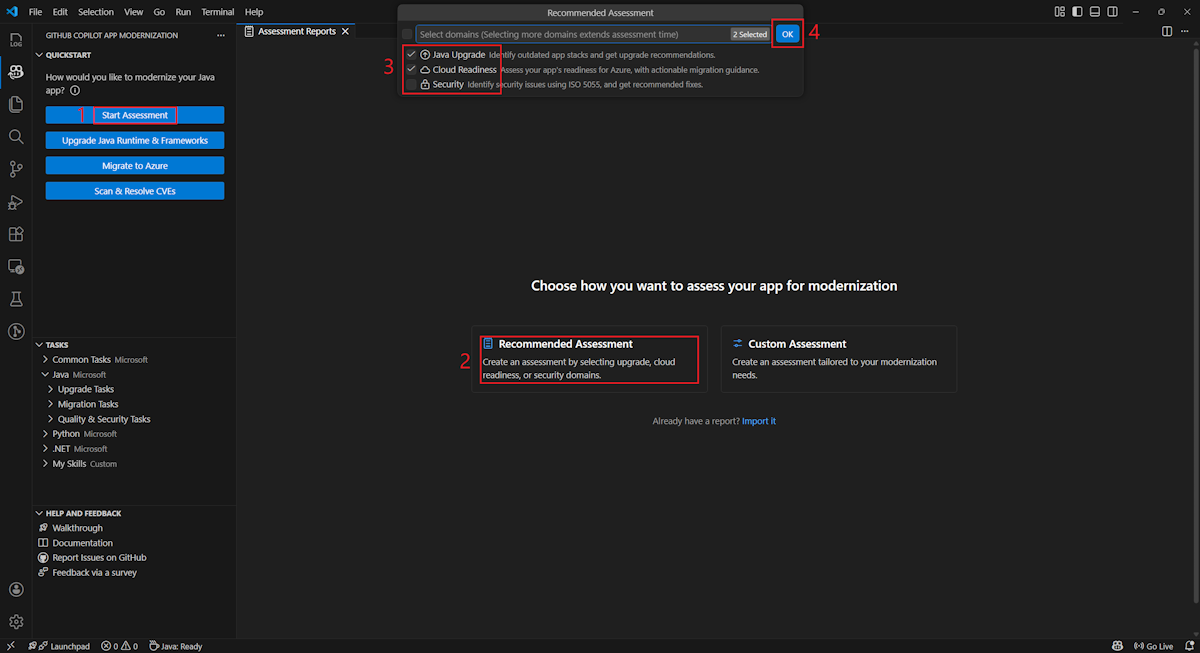 - Välj Starta utvärdering eller Öppna utvärderingsinstrumentpanelen i avsnittet SNABBSTART i gitHub Copilot-moderniseringsfönstret.