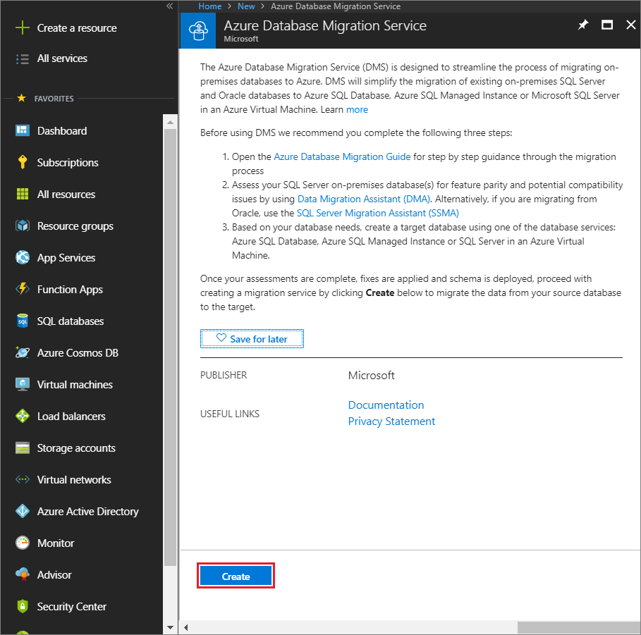 På skärmen Azure Database Migration Service väljer du Skapa.