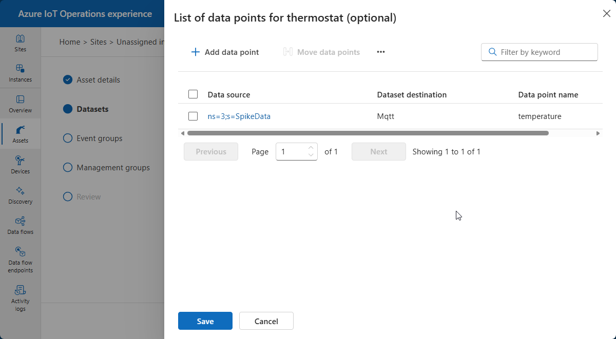 opc-ua-connectorenhet som du skapade i föregående steg. - Namnområden: Du kan visa namnområdet som du skapade när du distribuerade Azure IoT Operations. Namnområdet innehåller den tillgång och enhet som du skapade i föregående steg.
