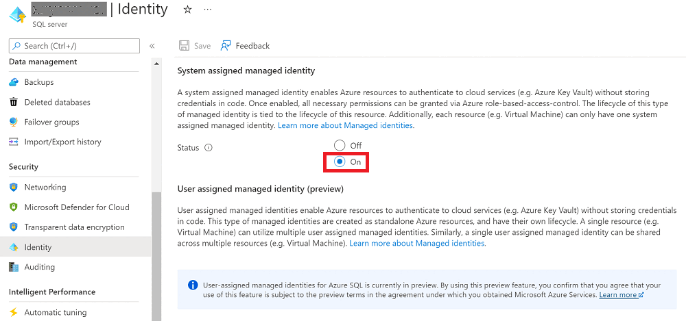 Gå till din logiska Azure SQL-server, välj Identitet, och ställ sedan in Systemtilldelad hanterad identitet till På.