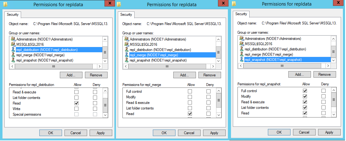 10. Upprepa föregående steg för att lägga till behörigheter för distributionsagenten som <Publisher_Machine_Name>\repl_distribution och för Sammanslagningsagenten som <Publisher_Machine_Name>\repl_merge.