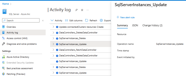 Aktivitetsloggar för SQL Server som aktiveras av Azure Arc ger insikter om händelser relaterade till SQL Server som aktiveras av Azure Arc och Visa Azure Arc-aktiverade inventeringsresurser . Aktivitetsloggar innehåller händelser som motsvarar skapandet och ändringen av resurser. Dessa händelser omfattar SQL Server-instansuppdateringar (SqlServerInstance_Update), SQL Server-databasuppdateringar (SqlServerDatabases_Update) och skrivning av taggar till resurser.