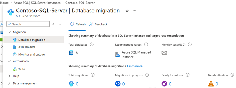 Fönstret Databasmigrering innehåller också en användbar sammanfattning av migreringsstatusen för din instans, till exempel antalet totala databaser, det rekommenderade målet, antalet slutförda migreringar och antalet pågående migreringar: