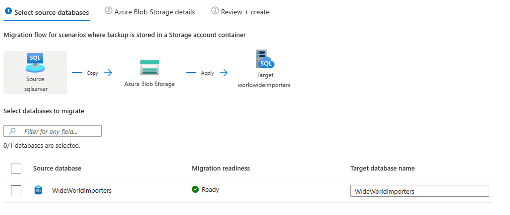 Följande paneler i fönstret Database Migration vägleder dig genom migreringen av dina SQL Server databaser till Azure SQL Managed Instance: