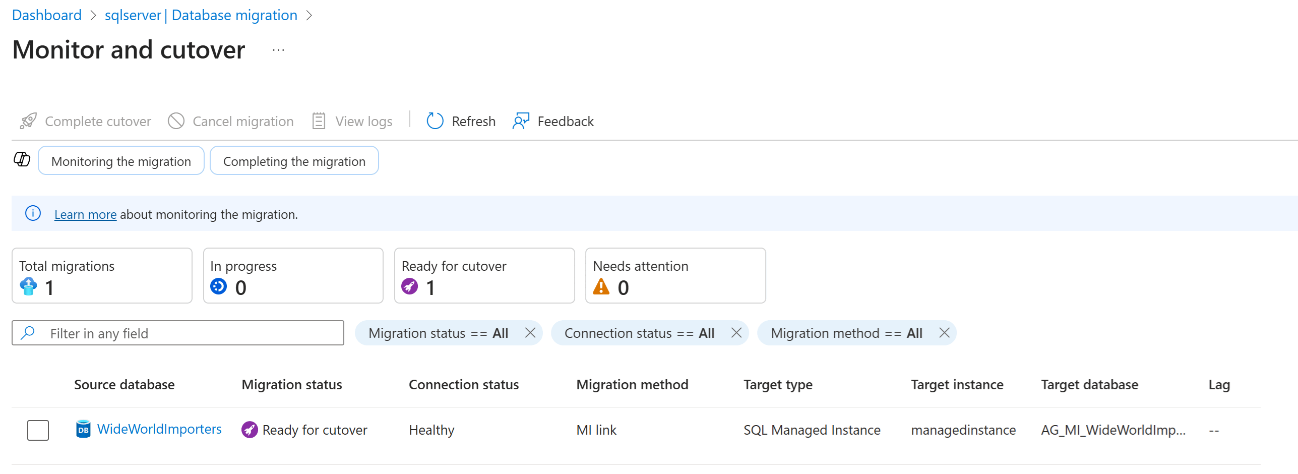 När migreringen är klar visas migreringsstatusen Klar för övergång. För att byta över till målinstansen SQL Managed Instance, välj Cutover i panelen Övervakning och byte. Du kan också använda detaljeringspanelen för databasen.