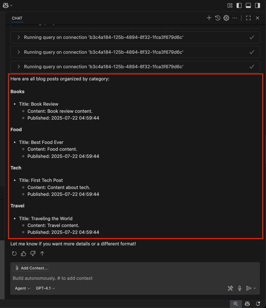 Skärmbild av ett annat exempel som använder ett agentverktyg för att ansluta till en databas och hämta data.
