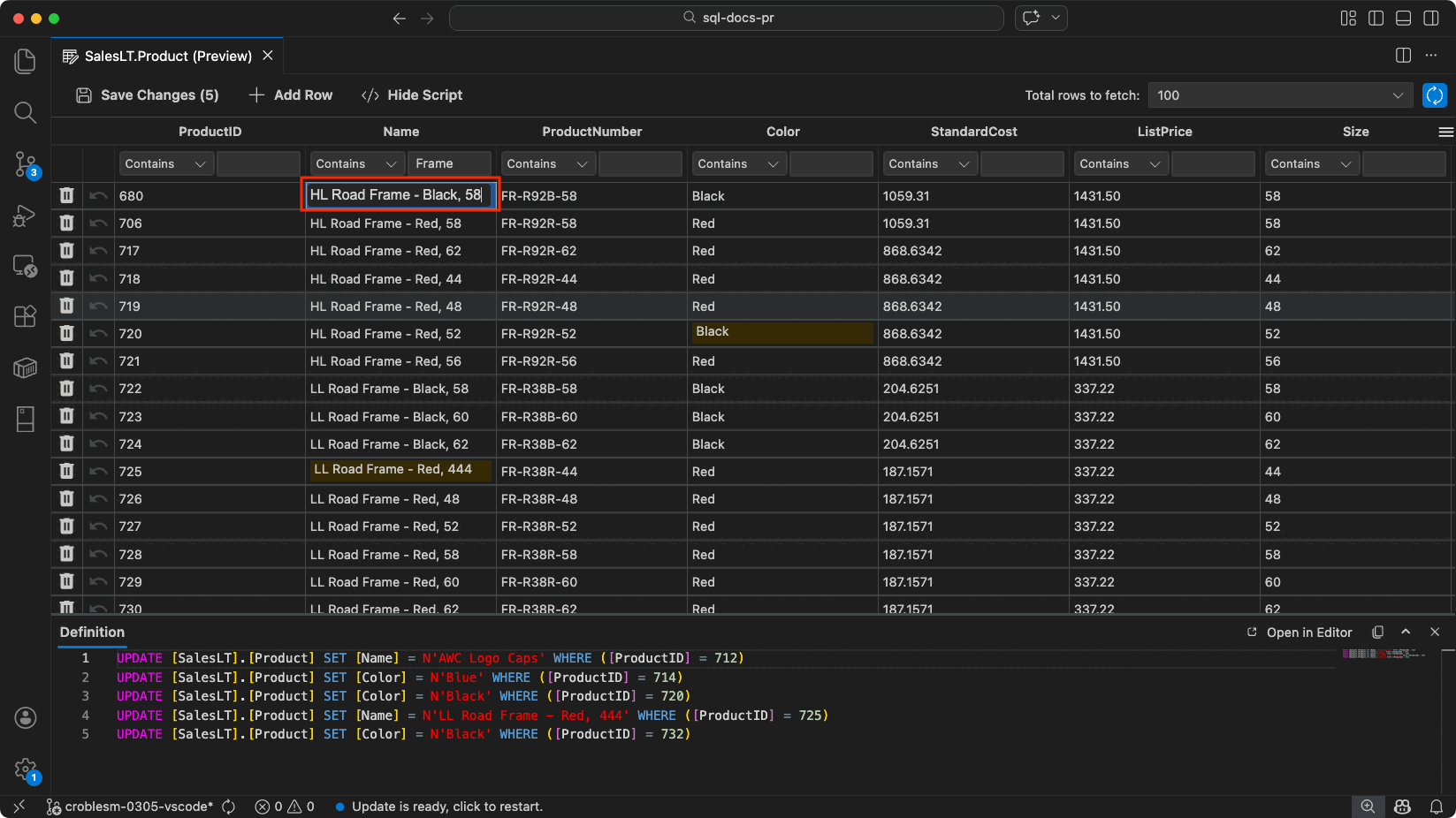 Använd Visa och redigera data för att bläddra och ändra tabelldata direkt i redigeraren, utan att skriva DML-instruktioner (T-SQL Data Manipulation Language).