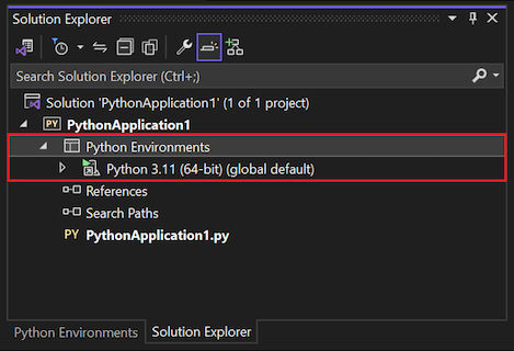 Du kan också använda kortkommandot Ctrl+K, Ctrl+' för att öppna fönstret Python-miljöer från Solution Explorer.