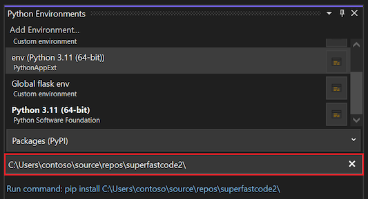 pipkommandot i Python-miljön som aktiverats för Python-projektet. När du expanderar den aktiva Python-miljön för projektet i Solution Explorer bör du se en post för C++-projektet, till exempel supersnabbkod.