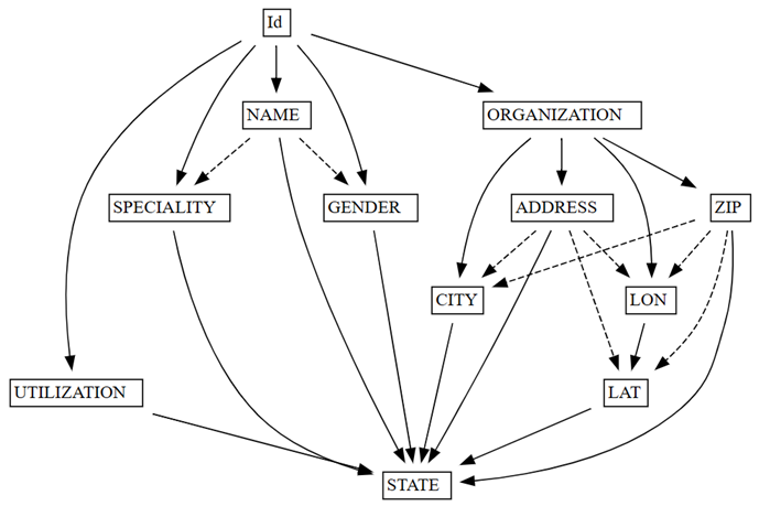 函数依赖项图还显示,ORGANIZATION 按预期确定 ADDRESS 和 ZIP。 但是,你可能预计 ZIP 也会确定 CITY,但虚线箭头表示依赖项只是近似的,指向数据质量问题。