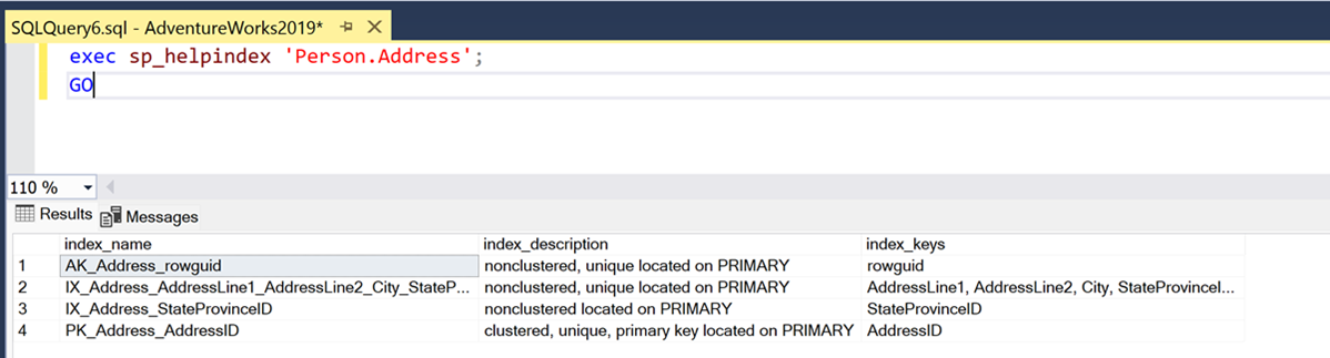 检查聚集索引的一种方法是使用 sp_helpindex 系统存储过程。 例如,我们可以通过执行以下语句来查看 Person.Address 表的索引摘要: