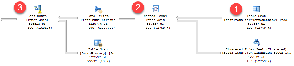 可查看实际行流与估计行数。 有三个值得注意的计划区域(从右到左显示):