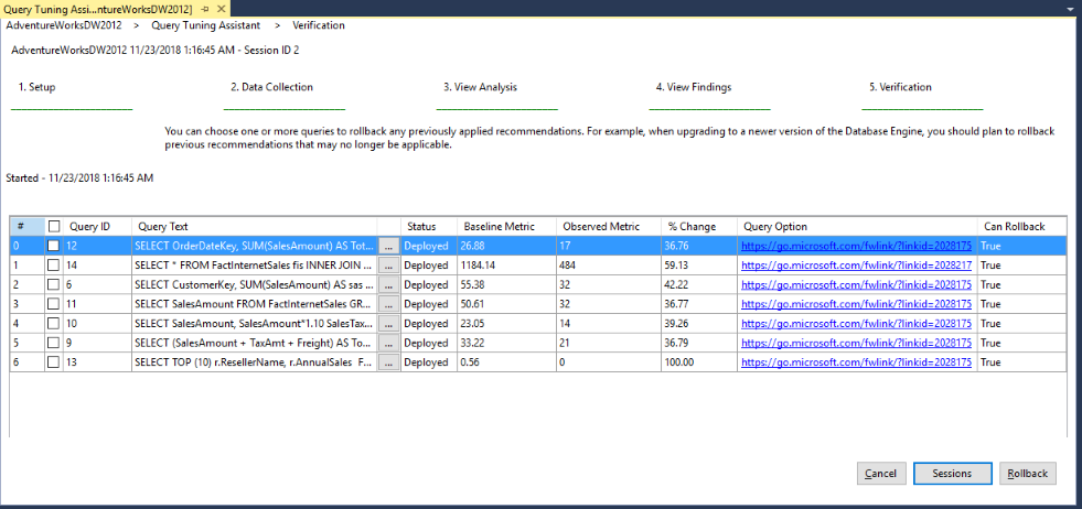 6. 验证:显示之前为此会话选定的查询的部署状态。 此页的列表不同于上一页,“可以部署”列更改为了“可以回滚”。 此列可以为 True 或 False,具体取决于是否可以回滚部署的查询优化以及是否可以删除它的计划指南
