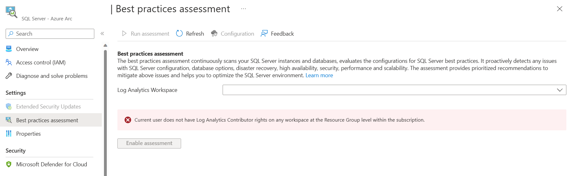 确保配置 SQL BPA 的用户必须在 Log Analytics 工作区的资源组或订阅上具有 Log Analytics 参与者角色。 最佳做法 评估 文章中可以找到先决条件列表。