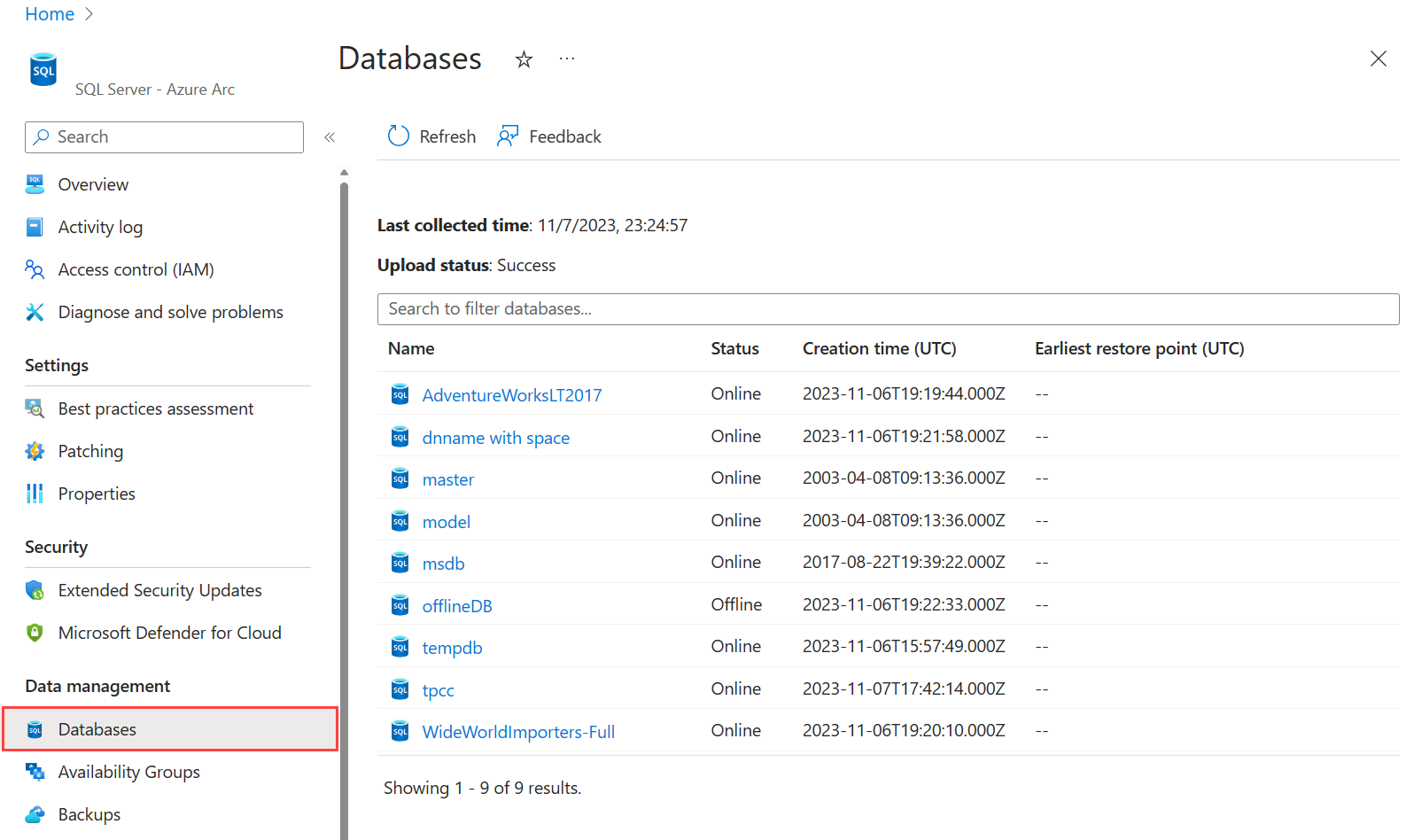 - 使用 SQL Server 数据库 - Azure Arc 区域查看属于实例的数据库。