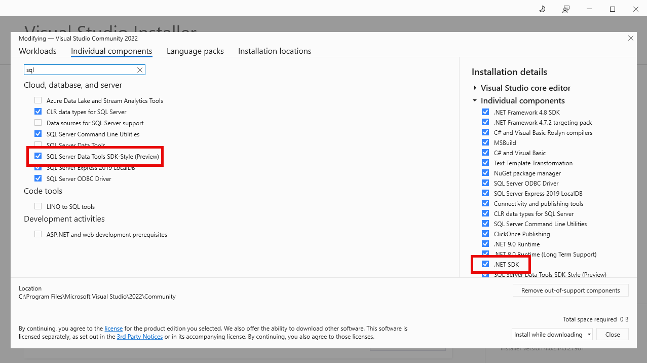 在 “单个组件 ”选项卡中搜索“.NET SDK”,然后选择“.NET SDK”组件。 选择此项会自动选择所需的依赖项,包括支持的 .NET 运行时。 .NET SDK 组件支持 Visual Studio 中Microsoft.Build.Sql SDK 的其他版本,这些版本可通过 NuGet.org 获取。