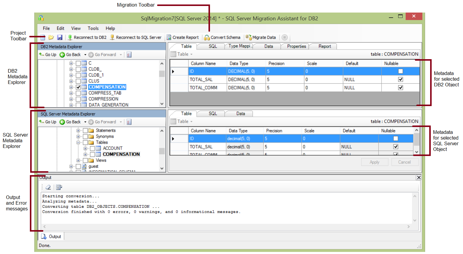 安装 SSMA 后,可以使用 SSMA 将 Db2 数据库迁移到 SQL Server。 建议在开始之前熟悉 SSMA 用户界面。 下图显示了 SSMA 的用户界面,包括元数据资源管理器、元数据、工具栏、输出窗格和错误列表窗格: