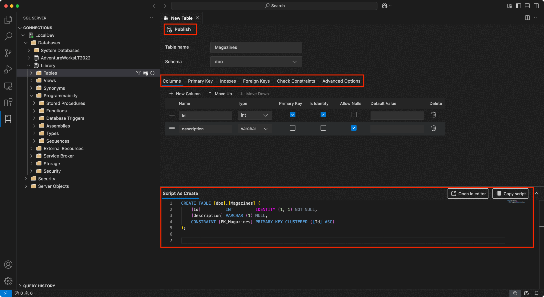 在设计器中,“创建脚本”面板提供了一个自动生成的 T-SQL 脚本,该脚本反映了您的表设计。 你有以下选择: