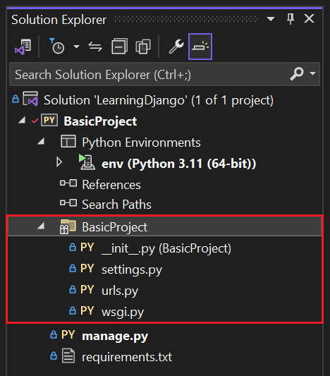 从命令行使用 Django 时,通常通过运行 django-admin startproject <project_name> 命令启动项目。 在 Visual Studio 中, 空白 Django Web 项目 模板在 Visual Studio 项目和解决方案中提供相同的结构。