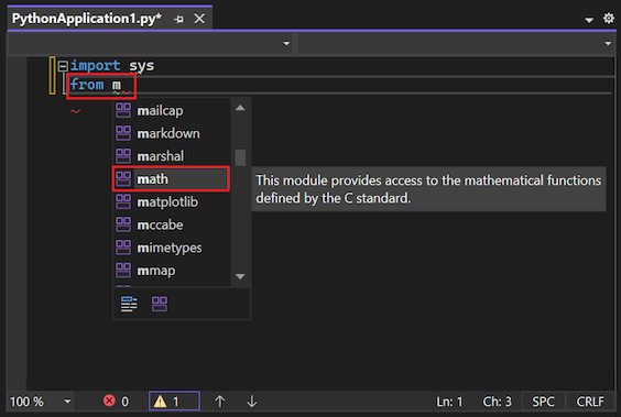 4. 移动到代码文件中的下一行,然后开始输入 from math 语句。 Visual Studio 显示函数的可能模块列表:
