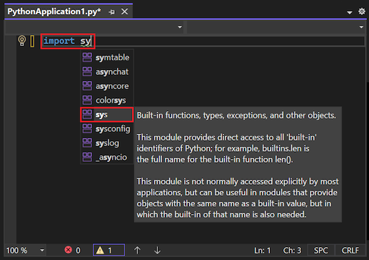 2. 开始输入 import sys 语句。 开始输入 sys时,Visual Studio 会显示 import 函数的可能模块列表: